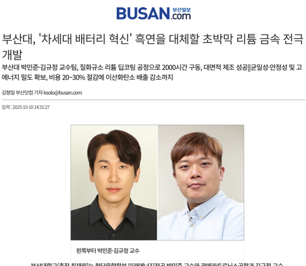 부산대학교(총장 최재원)는 첨단융합학부 미래에너지전공 박민준 교수와 광메카트로닉스공학과 김규정 교수 연구팀이 차세대 전기차와 스마트 기기 배터리의 핵심 기술로 꼽히는 ‘흑연을 대체할 리튬메탈 음극’을 대면적·초박막으로 제조하는 데 성공했다고 10일 밝혔다.