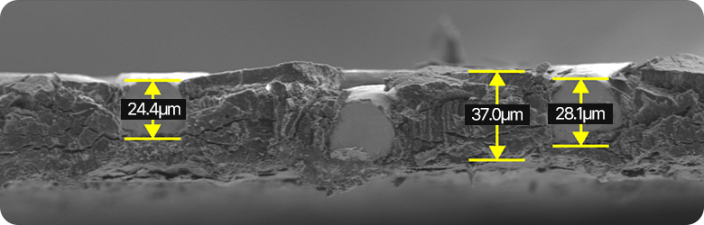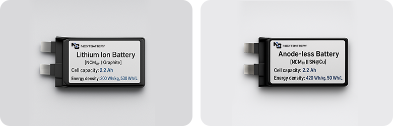 리튬이온전지 | 무음극 리튬메탈 전지 2.2 Ah 동일 용량의 셀 두께 비교